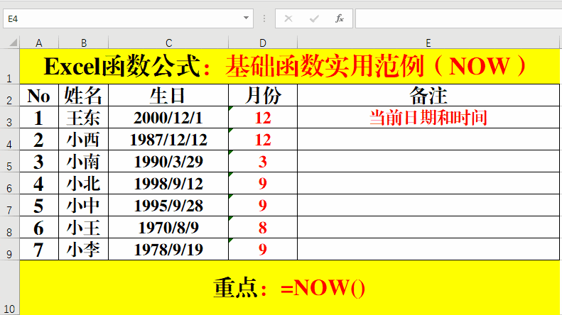 4、 四、NOW函数。作用:提取系统当前日期和时间。语法:=NOW()。方法:在目标单元格中输入公式:=NOW()。