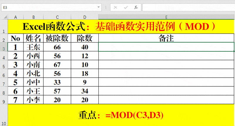 2、 二、MOD函数。作用:求两个数相处的余数。语法:=MOD(被除数,除数)。方法:在目标单元格中输入公式:=MOD(C3,D3)。