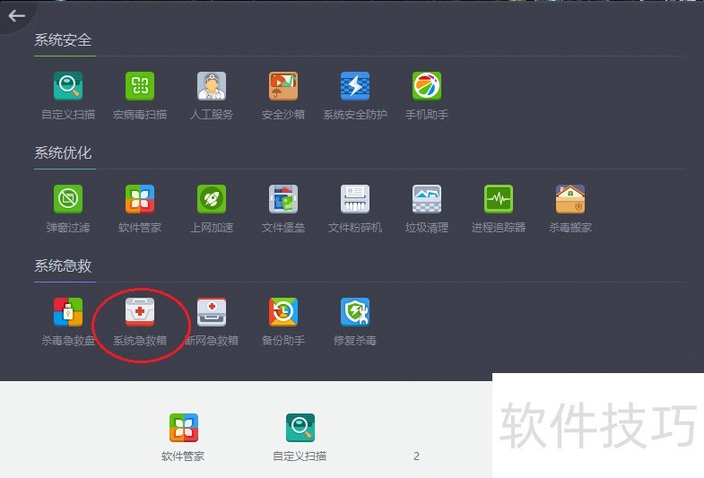1、 启动360杀毒,点击"系统急救箱"图标。