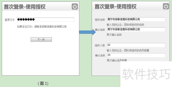 1、 点击图标运行探联年会摇奖系统,弹出授权框(图1),授权框默认之下有一个免费口令,点击“下一步”后弹出授权信息注册框(图2),授权注册信息也存在一个默认信息,不做任何操作,点击按钮完成授权。