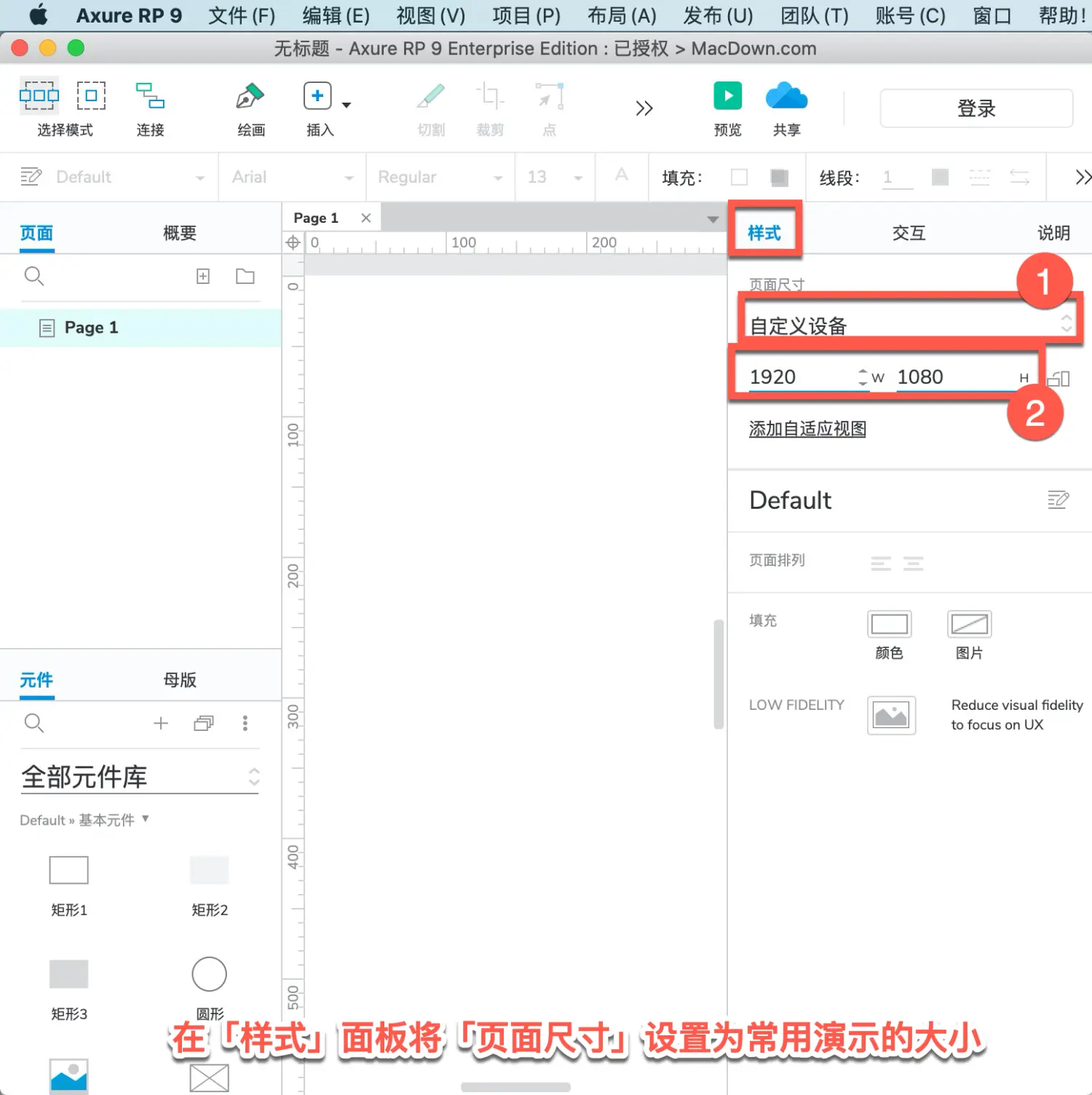 1、在「样式」面板中,将页面尺寸设置为1920×1080.适配演示需求。