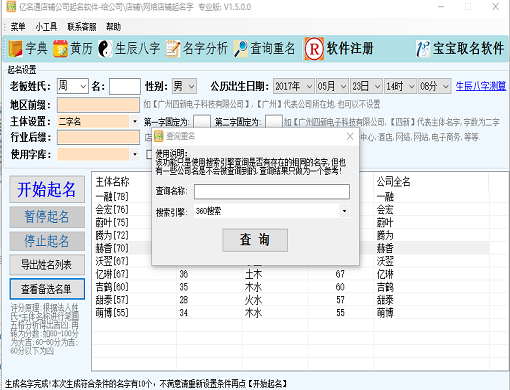 亿名通店铺公司取名软件是一款专业的起名工具,能够根据法人基本信息快速生成数万以上名字,并自动根据五行匹配进行搭配起名。该软件起名方法标准、符合常规方式,利用极佳的文字搭配,让用户轻松完成公司起名。用户只需输入法人的基本信息、公司地名、行业名称等即可快速生成好听、满意的好名字,并进行详细分析和打分。该软件适用于公司或店铺起名,帮助用户起一个吉祥如意、生意兴隆的好名字。