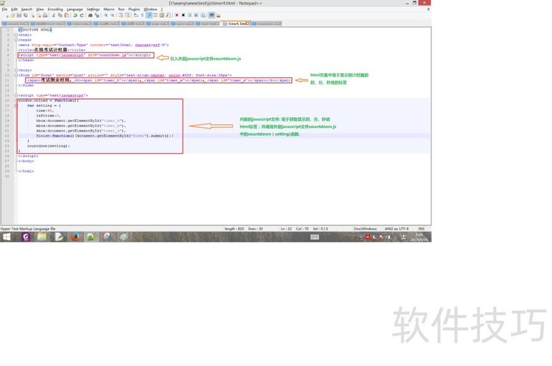 1、 html文件:显示倒计时器,其中<script></script>内嵌的脚本用于向指定的html标签中插入时、分、秒值;
