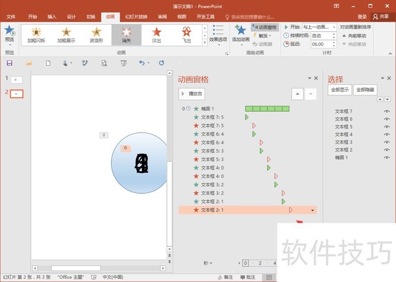 3、 第三步,我们来设置一下动画,先给正圆设置,参数设置为,开始在上一个动画之后,期间为一秒,重复6次,然后点击确定即可。4第四步,我们再对数字文本设置一下动画,先从数字5开始,需要两个动画,第一个“出现”,开始为与上一个动画同时;第二个“消失”开始为与上一个动画同时和延迟1秒。5第五步,之后再对4-0这5个数字,以此插入动画,都是选择一样“出现”与“消失”,不同的地方在于,“消失”动画的设置,5延迟1秒,4延迟2秒,3延迟3秒,以此类推。