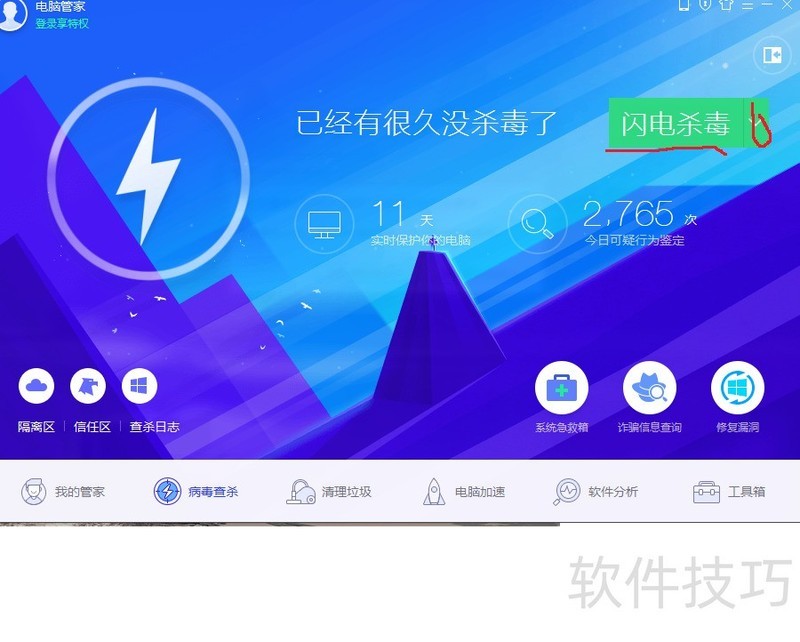 3、 点击下面的查病毒杀,然后可点击闪电杀毒,或者点击旁边的下拉箭头,自定义查杀路径。