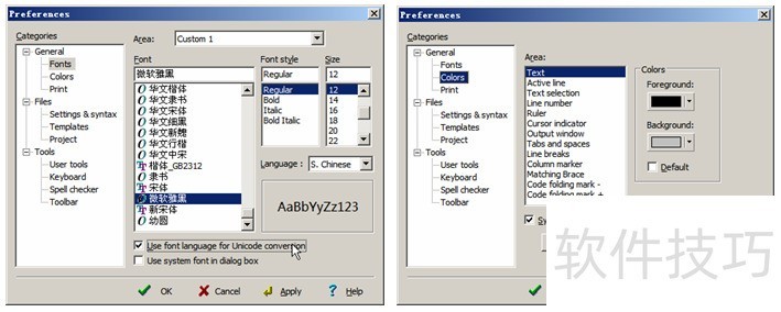 3、 你可以这样设置EditPlus编辑环境的背景颜色和字体。菜单【Tools】→ 【Preperences】→ 【General】→ 【fonts】和【colors】。需要说明一下的是:可以设置多种fonts,这样就可以很方便地切换fonts了(参看图2所示),这招对日企这样的朋友很方便哦。中文的字体设置几个,日文的字体设置几个,出现乱码的时候,切换一下字体就可以了。