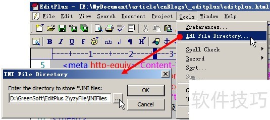 1、 设置EditPlus的配置文件路径因为EditPlus是可以绿色使用的(直接解压那个EditPlus压缩包文件即可直接使用,不用安装),所以,当我们对EditPlus进行一系列的配置以后,保存下这些配置文件。以后当我们重装系统,或者换台电脑使用的时候,只要重新加载一下那些配置文件,以前的配置就都重新回来了,很是方便。所以,在讲其他配置和技巧之前,我们先设置好EditPlus的配置文件路径。打开EditPlus → 【Tools】→ 【INI File Directory...】 → 在弹出的对话框中设置配置文件的保存位置(压缩包内的配置保存文件在解压目录下的"yzyFileINIFiles"目录下)。这里你可能要重新设置一下目录,因为,我喜欢把EditPlus放在"D:GreenSoftEditPlus 2"下(把所有的绿色软件装在一个目录下,每次重装系统的时候,可以直接把绿色软件拷回去,就能直接使用了,从而避免了每次都安装那么多软件)。所以,就请你重新设置一下,根据你的习惯,把配置文件存放在某个目录下吧。