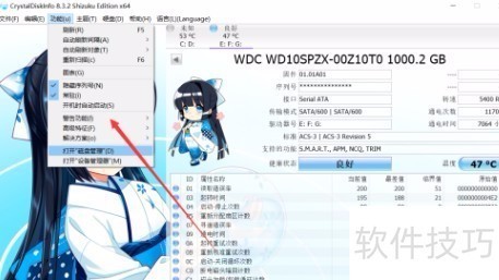 1、 首先,打开CrystalDiskInfo。然后,点击功能。