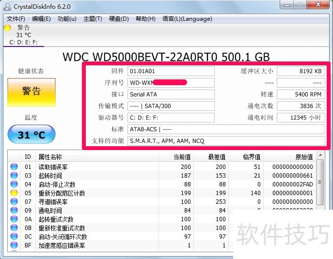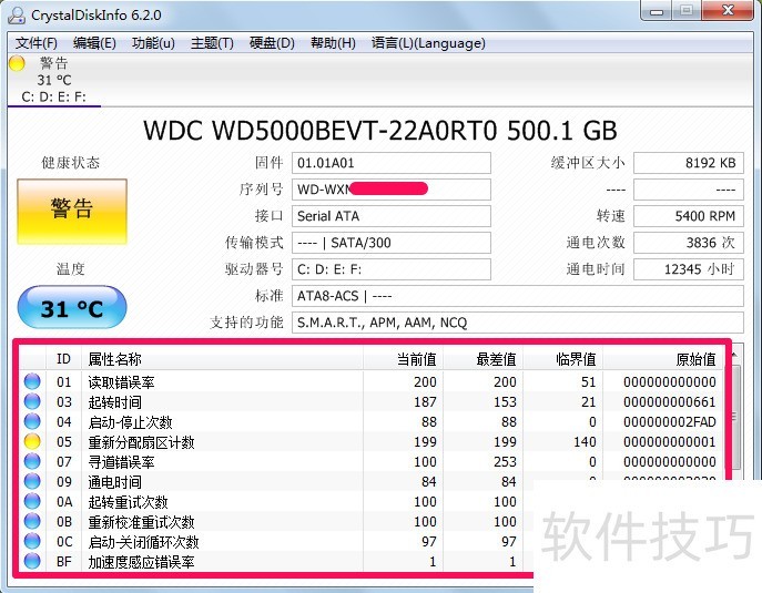 2、 在crystaldiskinfo的下方可以看到硬盘的各项数据,并显示出当前值、最差值以及临界值等,可以快速的对比出硬盘的健康状况。
