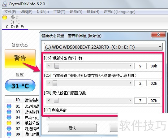 3、 点击crystaldiskinfo左侧的健康状态图标可以设置硬盘警告的临界值,当超过这个值软件就会发错警告。