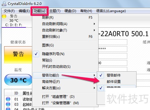 4、 在crystaldiskinfo的功能中可以设置警告功能,包括发送右键警告以及修改警告的声音等等。