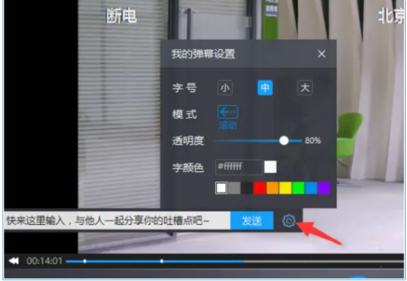 2、在“弹幕发送”窗口中,点击右侧的“设置”按钮,进入弹幕设置界面。