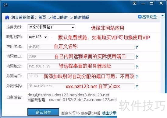 4、 在目标电脑或所在内网安装使用nat123并添加远程桌面地址的映射,将内网远程桌面地址映射为外网地址