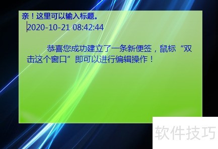 4、 双击第一个图标,会出现如图所示绿色便签,非常清新的感觉,而且还可以设置透明度,不影响桌面其他文件的运行。