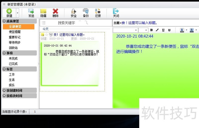 5、 工具栏的第二项是便签管理器,可以对便签的各项功能进行设置。便签的式样,或者颜色都可以随意进行设定,非常人性化。