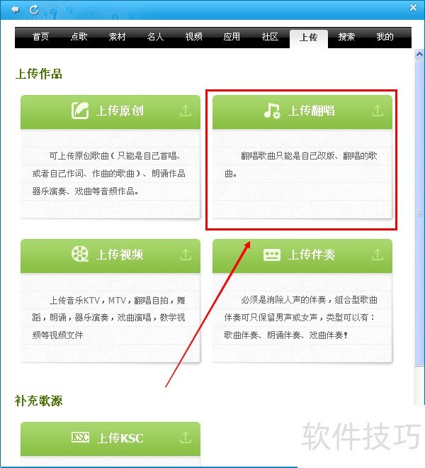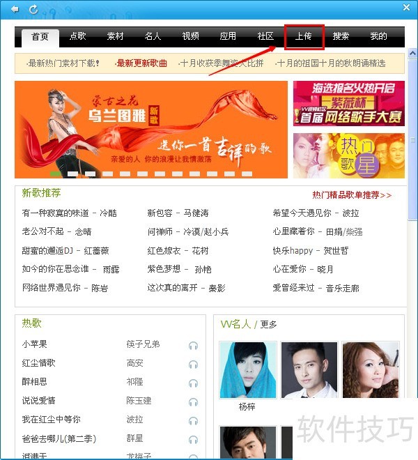 2、 点击点歌台,点击上传。