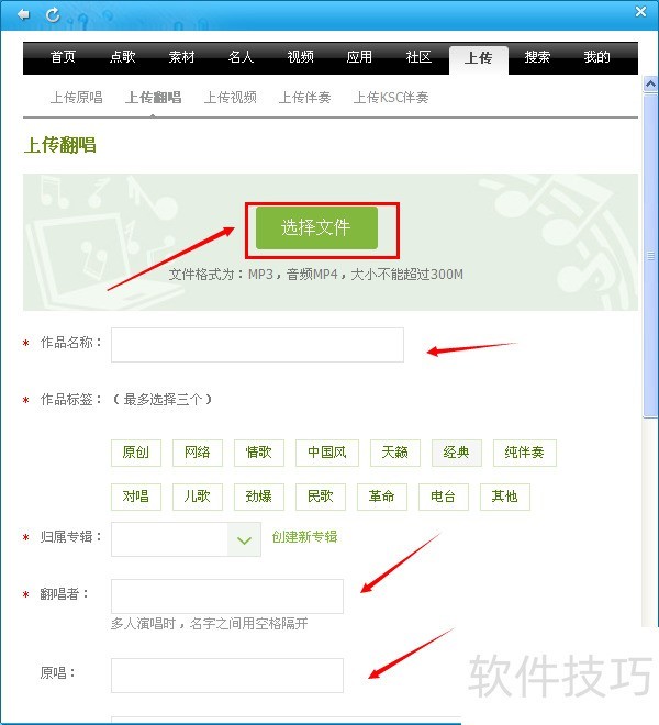 4、 点击选择文件,选择你录制好的歌曲,填写完整歌曲资料,点击上传。