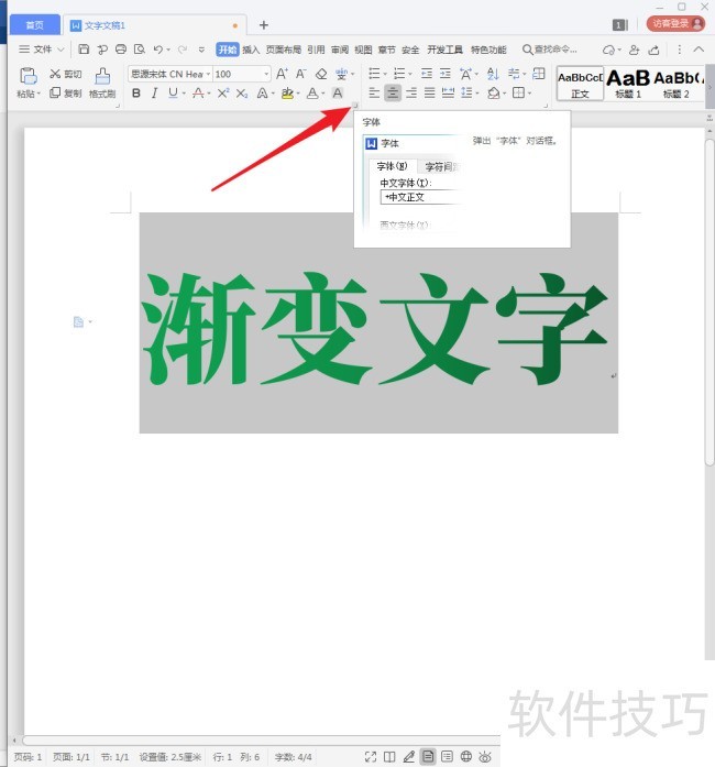 5、 但是,预设渐变色种类很少,如果需要使用自己需要的两种颜色的话,该怎样设置呢?选中设置了渐变色的文字,点击【字体】对话框启动按钮。