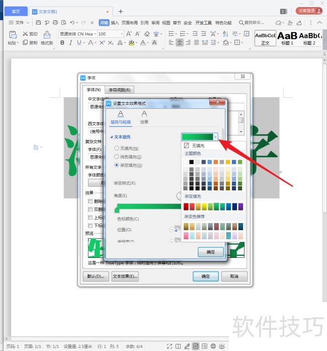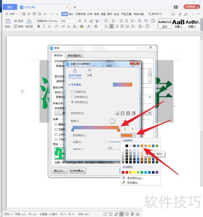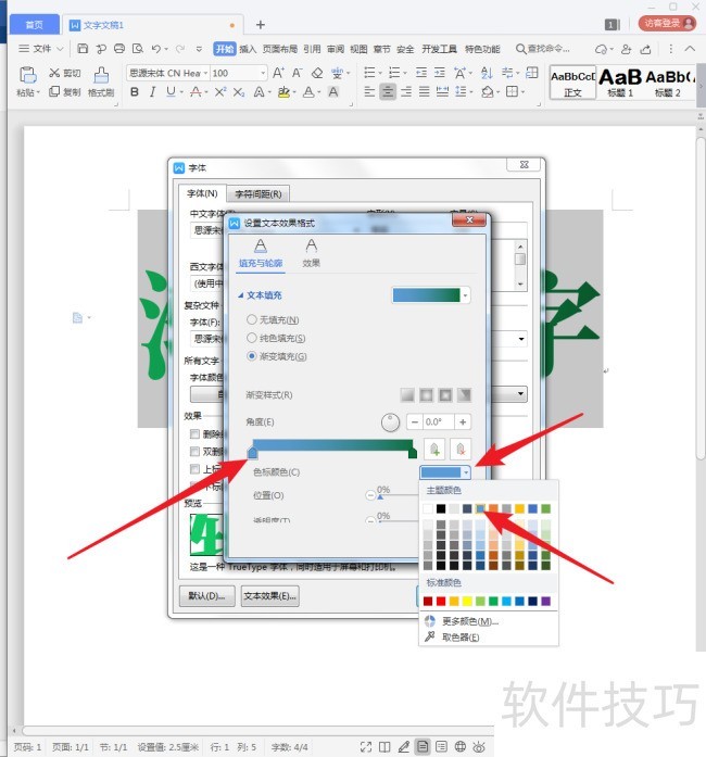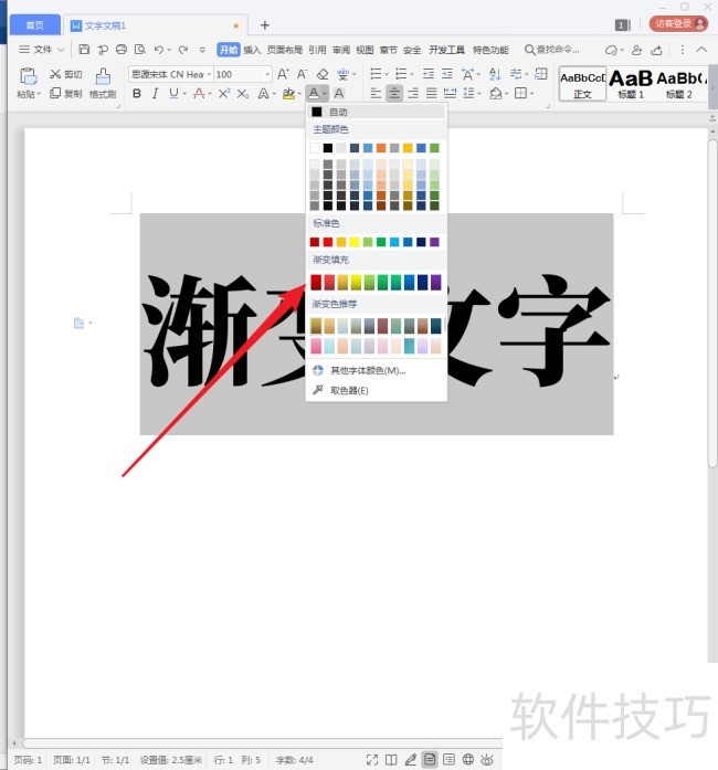 3、 选中文字,点击文字颜色命令按钮,在列表中有现成的渐变填充色。