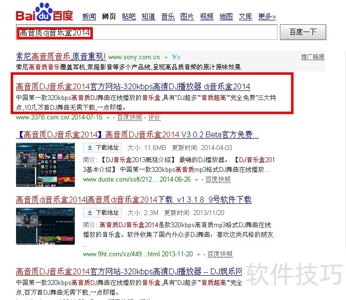 1、 ⑹紫任颐窃谕绲乃阉骺蚶锸淙搿案咭糁蔇J音乐盒2014”因为版本一直在更新所以我们选择的时候也一定要选择最新的版本来安装,搜索结果出来后我们点击首页展示的第冷获二个位置进入,当然也许你搜索的结果和我的不尽相同,那么你可以根据下驼案面图例参考进入便可,