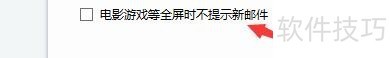 5、 在“提醒”窗口中,将“电影游戏等全屏时不提示新邮件”勾选上