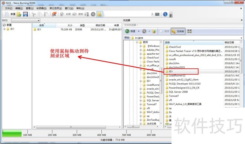 13、 如下图将需要刻录的文件直接拖动到空白区域,