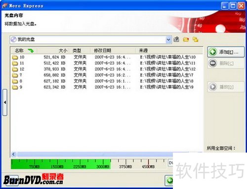 3、 第3步,打开“光盘内容”对话框,首先在窗口左下方的DVD盘片类型列表中选择DVD盘片类型(DVD5或DVD9),然后单击“添加”按钮,如图2009011737所示。?图2009011737 单击“添加”按钮?