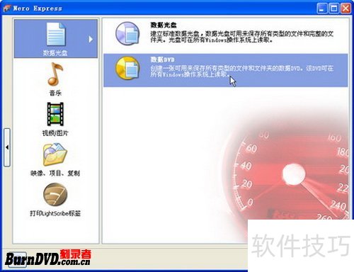 1、 第1步,在开始菜单中依次单击“所有程序”→Nero 7 Premium→“数据”→Nero Express命令,运行Nero Express程序。?2第2步,在Nero Express程序窗口左窗格中单击“数据”选项,然后在右窗格中单击“数据DVD”选项,如图2009011736所示。?图2009011736 单击“数据DVD”选项?