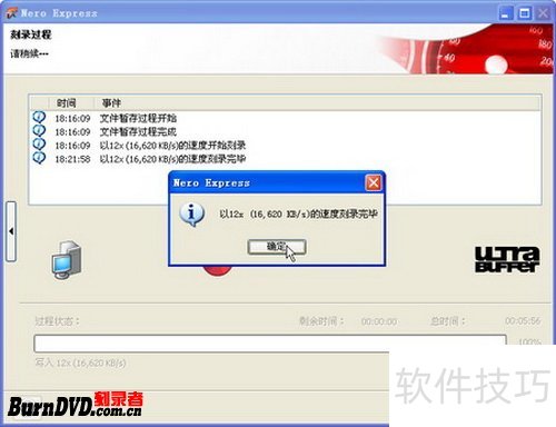 7、 第7步,Nero Express进入刻录进程,刻录过程无需人为参与。刻录完成以后光盘会自动弹出,并提示用户刻录过程已经完毕。在打开的提示框中单击“确定”按钮即可,如图2009011741所示。?图2009011741 数据光盘刻录成功?