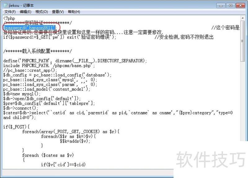 3、 将jiekou.php文件复制到网站的根目录下,并用记事本打开该文件,修改“密码验证”栏目password处的密码