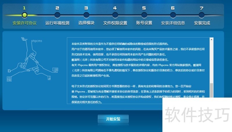 3、 访问站点网址,进入phpcms安装界面,点击"开始安装".
