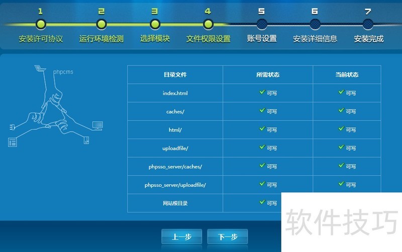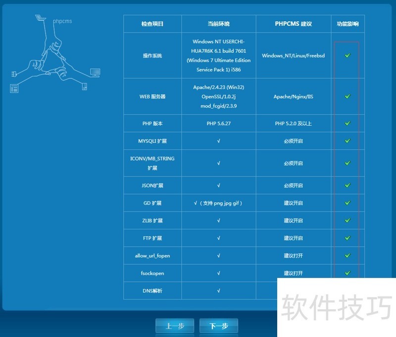 4、 检测安装phpcms的环境配置无误后,点击"下一步".