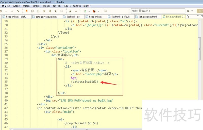 5、 第五步:在list.html文件里,找到显示面包屑的代码,很明显可以看出,{catpos($catid)}标签可以显示当前位置,即面包屑: