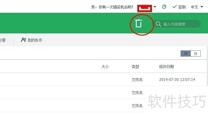 2、 登录快盘以后我们可以看到在页面的顶部有个类似回收站的按钮,点击该按钮