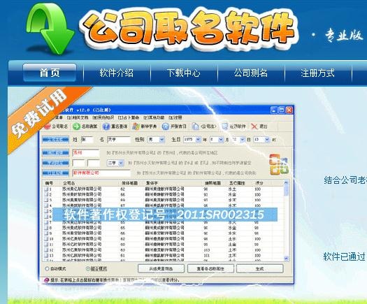 公司起名软件是一款专为新公司起名的工具。通过该软件,用户可以轻松生成几千个好名字,并进行评分和查重名等操作。软件具有以下特点:1、一键生成几千个好名字,满足用户对公司名称的需求;2、显示公司名字分数,让用户挑选100分好名;3、支持任意选择上百万个2字名、上千万个3字名、上亿个4字名;4、结合公司老板起名多种因素,如姓氏、生辰八字等。该软件的优点是新增了组合模式起名功能,可以将用户输入的字组合成公司名字并进行评测。同时,该软件为绿色版,无需安装即可使用。安装步骤如下:1、下载最新安装包并按照提示进行安装;2、等待安装完成即可开始使用。