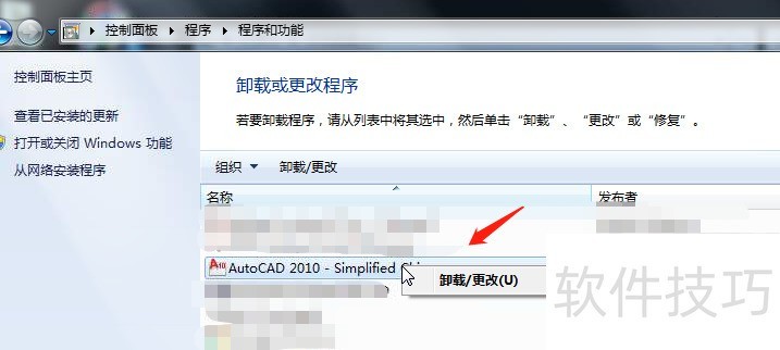 2、 在弹出窗口,找到AutoCAD 2010,右键点击卸载/更改