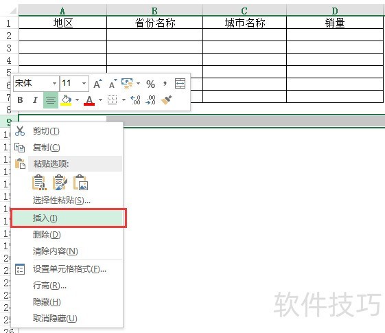 1、 一般的,我们插入单元格时都是插入一整行或者一整列,这时我们只需将指针放在行行号或列号上点击右键,选择“插入”即可插入一行或一列,选择多行或多列则可以同时插入多行或多列。