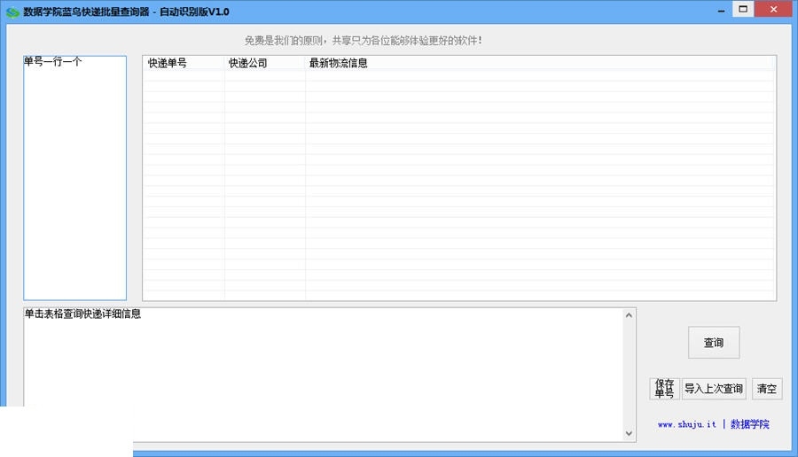 快递查询助手是一款功能强大的软件,能够自动识别快递单号并批量查询最新物流信息。该软件响应了广大网友的需求,经过精心设计和开发,旨在提供便捷的快递查询服务。用户只需输入快递单号,软件即可自动识别并显示最新一条物流信息,方便用户快速查件和解决问题。此外,该软件还具备批量查询功能,可同时查询多个快递单号,提高查询效率。总体而言,这款快递查询助手是一款实用而方便的工具,为用户带来更好的使用体验。