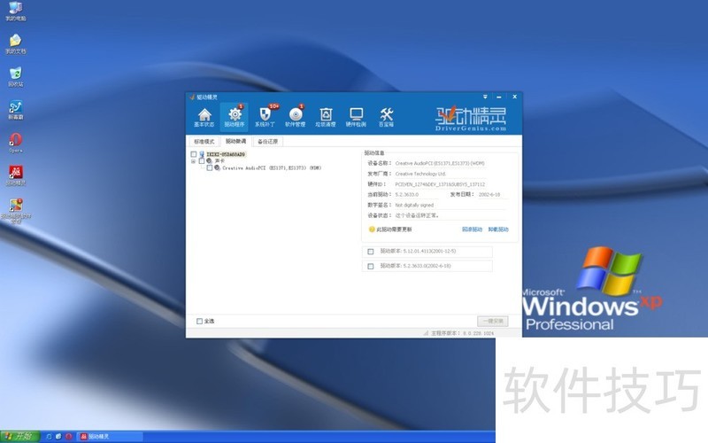 2、 接下来,运行驱动精灵,选择一键体检。体检结果显示,声卡驱动存在问题。3切换到驱动程序标签卡,标准模式选项卡,选择一键安装。最后一幅图是安装好之后的对话框。4选择驱动微调,在这里可以对已经安装好的驱动进行调整。可以选择不同的版本以兼容当前操作系统。