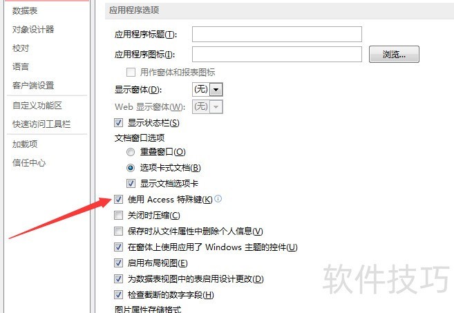 5、 进入到了 当前数据表?? 界面中,去掉勾选上 使用access特殊键? 选项