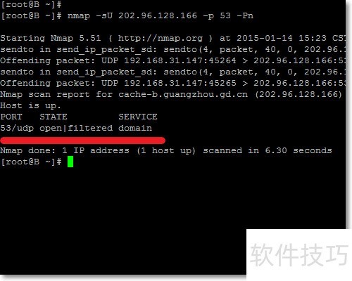 1、 我们可以使用nmap来扫描端口UDP 可以使用下面的命令来看看nmap -sU 202.96.128.86 -p 53 -Pn