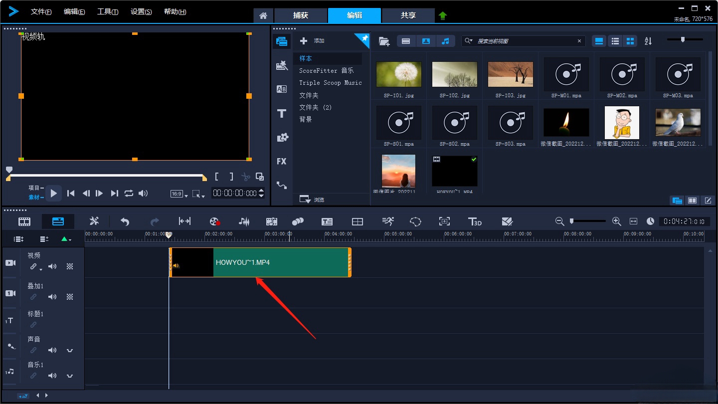 2、拖动视频:将视频拖至下方轨道。