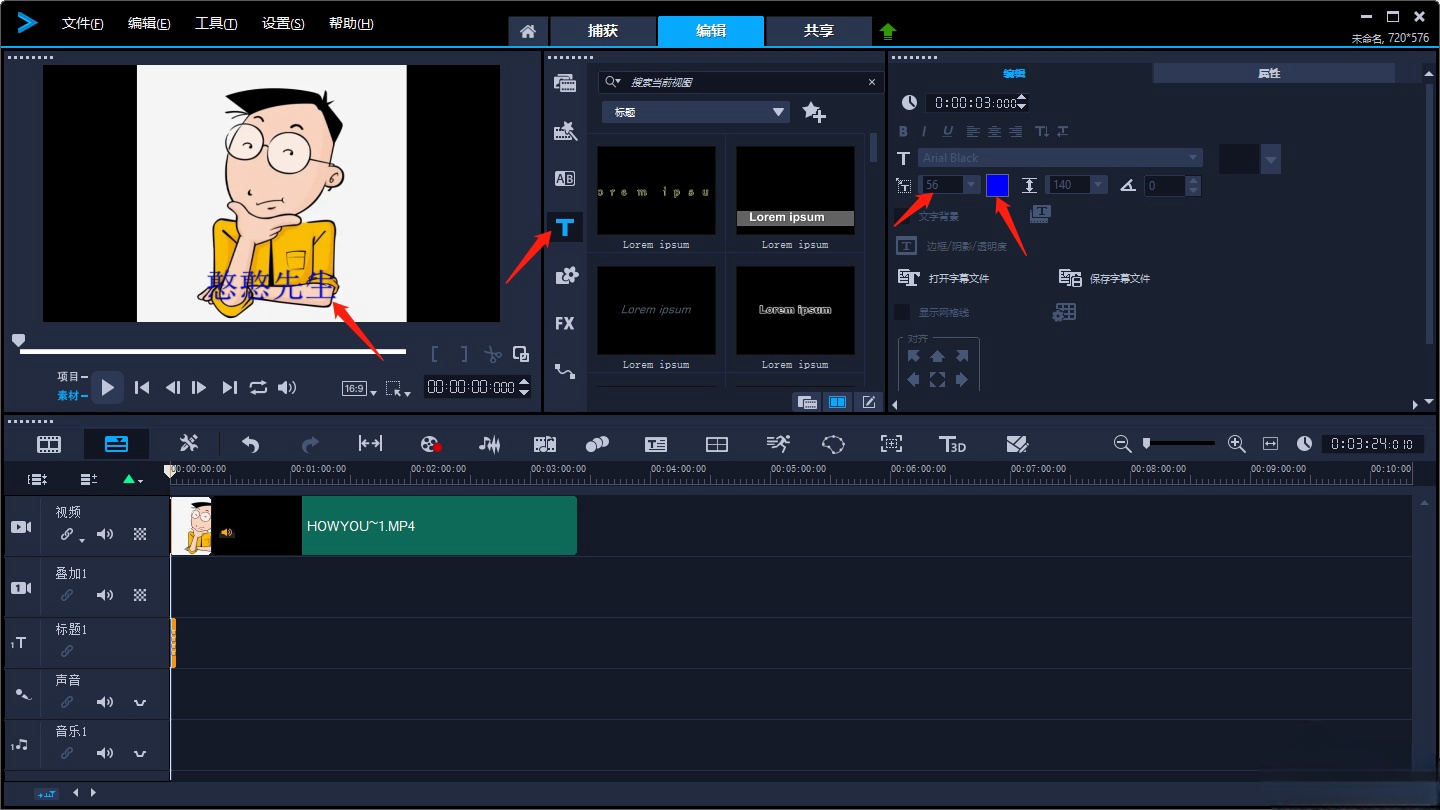 6、添加字幕:点击【T】图标或双击图片添加字幕,设置颜色、字体和大小。