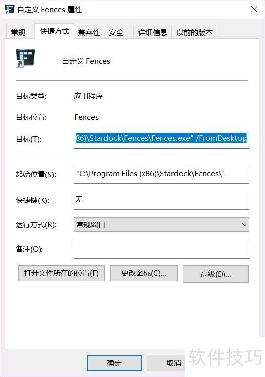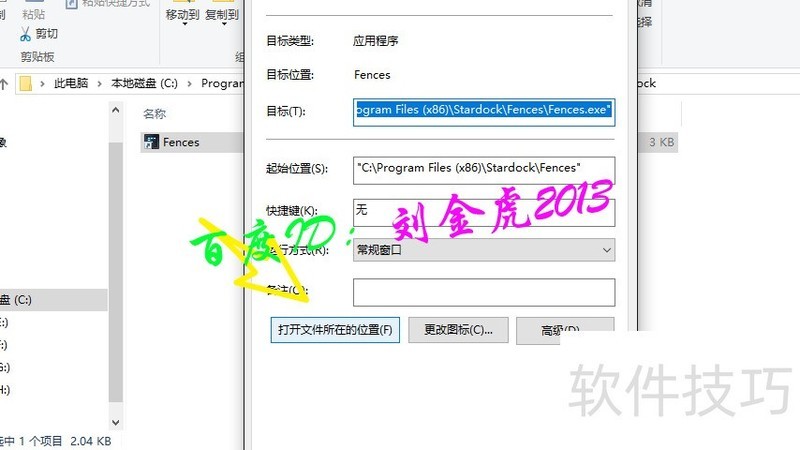 4、 上一步骤打开的是fences的快捷键所在的位置,这里右击属性,选择打开文件所在位置,找到真正的目录