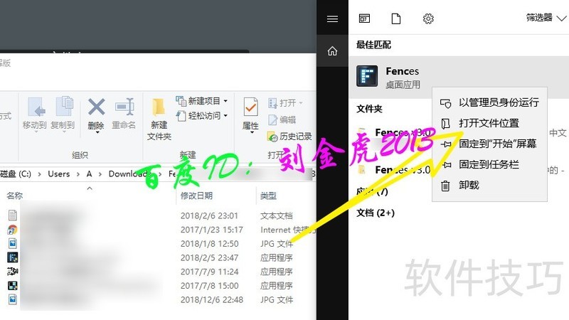 3、 使用快捷键windows+S,搜索fences,右击选择打开文件位置