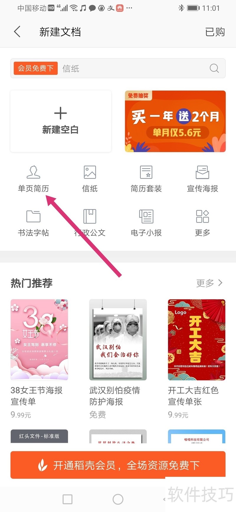 5、 选择一个免费的简历模板,如图所示。6然后点击简历模板的任何部分根据需要进行编辑,如图所示。
