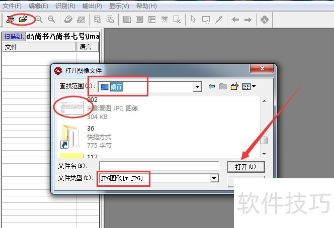 2、 单击单开文件工具,选择桌面,文件格式选择jpg,文件名002.jpg,选中它,单击打开按钮,打开文件。