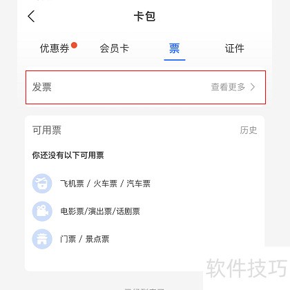2、 在卡包票页面,点击发票查看更多进入。