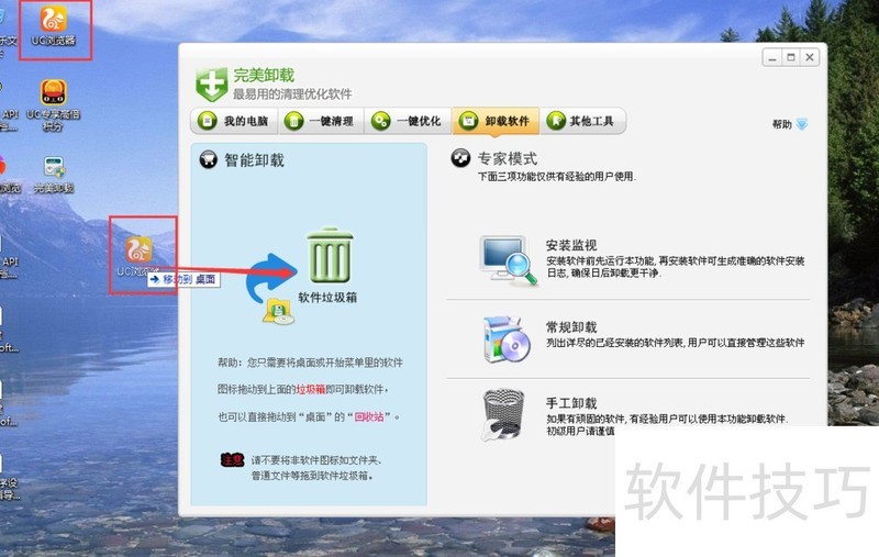 4、 看到左边的 垃圾桶没?我们可以把要卸载的软件的图标拖拽到这个区域(这里以UC浏览器为例子)···