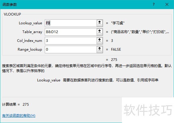 3、 按照图示设置数据解释:Lookup_value是条件区域,即学习桌F9这一单元格Table_array是我们要搜索数据区域Col_index_num是商品的单价在表格中,从左往右数第三个Range_lookup为0时,显示FALSE,此时为模糊查找